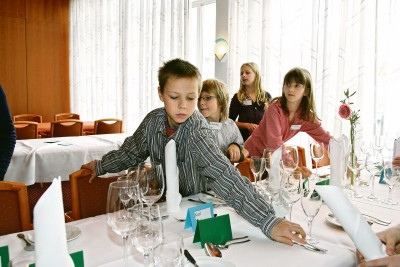 Seit über zehn Jahren gibt die Expertin für Etikette ihr Wissen nun schon an andere weiter – von den Kindern bis zum Top-Manager ist alles dabei. Nach dem „Aperitif“ geht es nebenan ins Hotelrestaurant. Das haben die Kinder heute ganz für sich. Doch dabei wären die 25 Jungen und Mädchen garantiert in jedem feineren Restaurant gern gesehene Gäste. Es gibt kein Geschrei und kein Genörgel, manierlich sitzen die Kinder an der langen Tafel. Serviettenbrechen und Eindecken, Fragen der Sitzordnung und des guten Tons für ein nettes Tischgespräch ohne peinliches Schweigen geht die Knigge-Expertin nun mit ihnen durch.